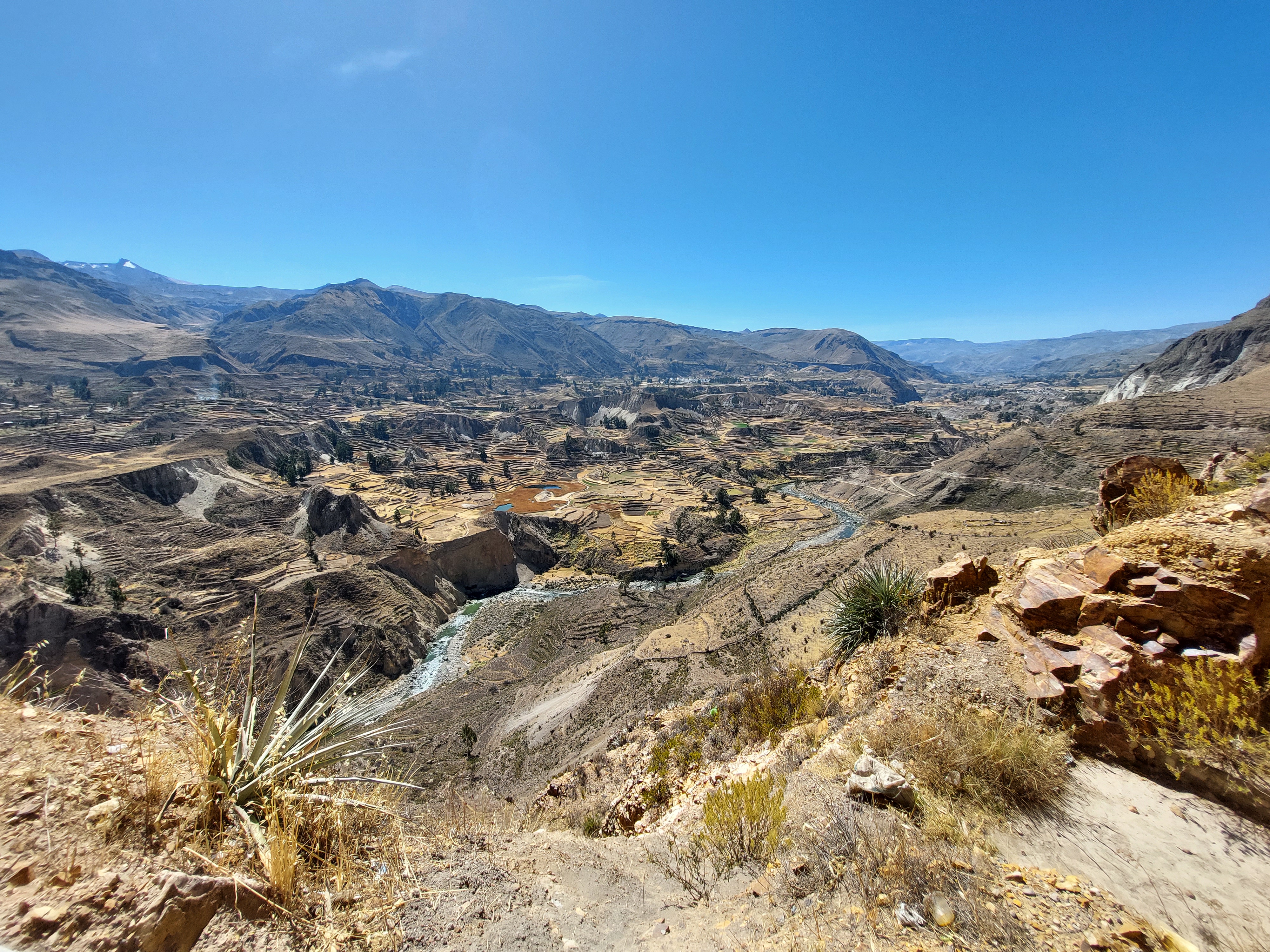 Disfrutarás del paisaje Rumbo al Cañón observaras camélidos en el recorrido al Valle y podrás tomarte fotos en la carretera Paso por la zona de Pampa Cañahua, reserva natural de vicuñas y otros camélidos andinos (Reserva Nacional de Salinas y Aguada Blanca). Parada en Patapampa, ubicada a 4900m de altitud para admirar los volcanes Ampato, Sabancaya y Hualca-Hualca Llegada a Chivay y luego un recorrido al mercado local. LLegaremos justo para que puedas tomar desayuno y asi conoceras el Margen derecho e Izquierdo de tu recorrido pasando por los pueblitos como MACA, YANQUE traslado a tu hotel